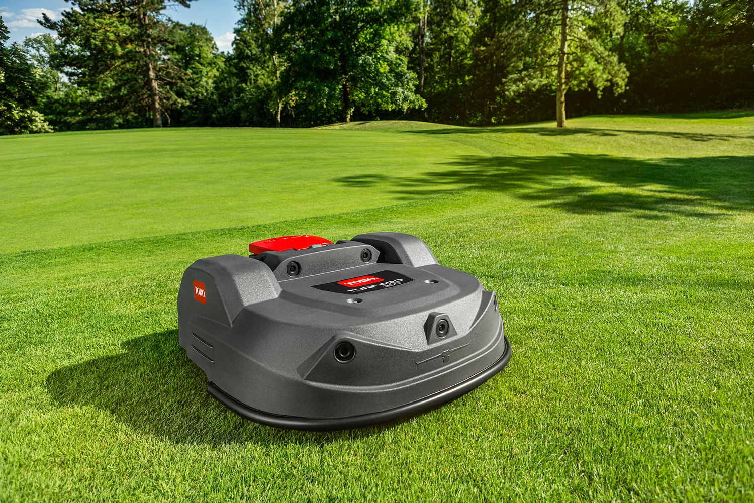 Fotografie von autonomen Rasenmähern des amerikanischen Herstellers Toro an einem herrlichen Sommertag auf dem Golfplatz.